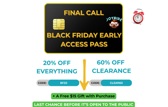 Hey there! Tonight is your last chance to take advantage of our Early Black Friday sales before they're opened up to the public. Get what you want + a free $15 Tote bag with your order, before your favorite products go out of stock! Use Codes: BF20 for 20% OFF CLEAR60 for 60% OFF Clearance Items | | | | | | Fast Shipping | Free Exchanges | 365 Day Warranty | | | | | | No longer want to receive these emails? Unsubscribe. Joyride Harness 1905 N. Wilcox Ave Suite #309 Los Angeles, California 90068 | | | | | |